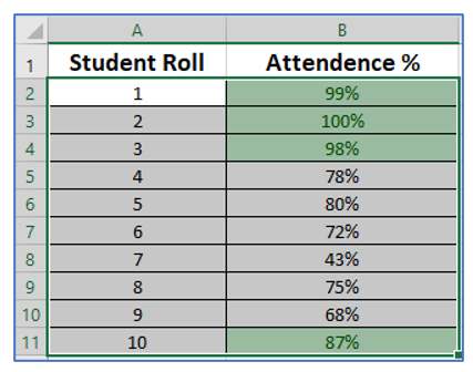Given a dataset of student attendance. In the given data set the rows are colored with green whose attendances are greater than 85%. Try putting all the cells at the top whose attendance are greater than 85%.