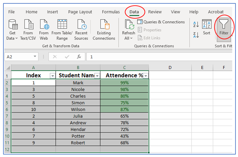Given a dataset of Students attendances. In the given data set the rows are colored with green whose attendances are greater than 80% and red whose attendance are below 80%. Try putting all the cells at the top whose attendances are greater than 80%.